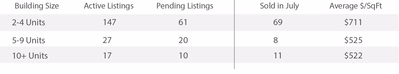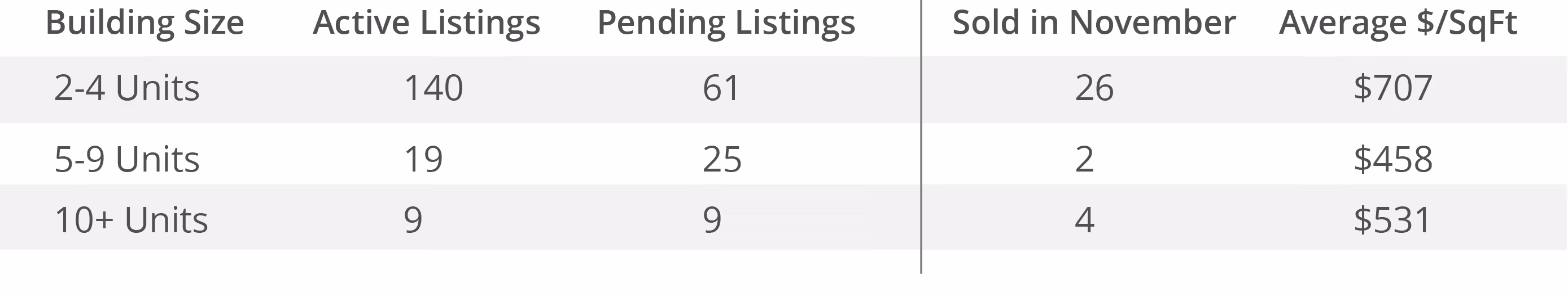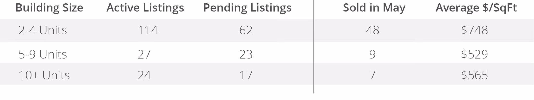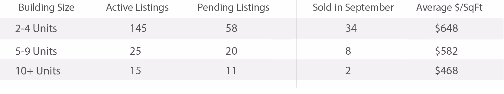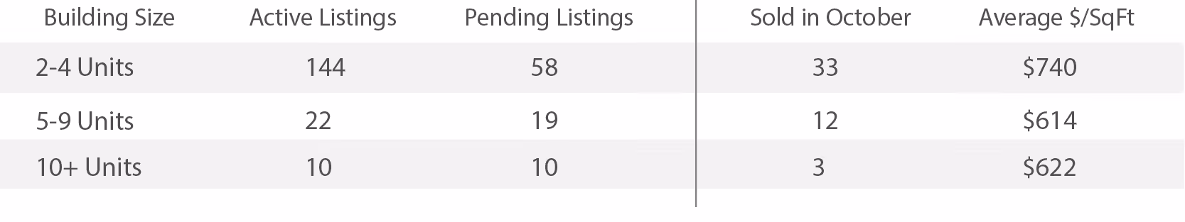 Track San Francisco's multi-unit property market month by month. See active listings, pending sales, closed transactions, and average price per square foot for 2-unit through 10+ unit buildings. Use this data to understand where the market is heading and how your property compares.